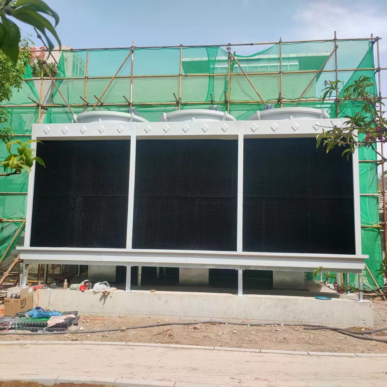 产品详情 山东通风设备厂家 产品栏目PRODUCTS 风机系列 轴流风机 离心风机 屋顶风机 隧道射流风机 其他风机 阀门系列 防火阀 风量调节阀 其他阀门 风机盘管 暗装风机盘管 明装风机盘管 风机箱系列 送风风机箱 排烟风机箱 风幕机 贯流式风幕机 水箱系列 不锈钢水箱 玻璃钢水箱 搪瓷水箱 镀锌水箱 冷却塔 冷却塔填料 圆形冷却塔 方形冷却塔 通风口 散流器 百叶 异形风口 通风管道 消声器 风管配件 通风管道 新风机组 新风换气机 吊顶机组 空调主机 风冷模块 空气源热泵 过滤器 表冷器 风冷菇房空调分体机 风冷菇房一体机 工厂化菇房主机 水源菇房一体机 螺杆机组 抗震支架 抗震支架 废气处理系统 厨房油烟净化器 活性炭吸附箱 等离子光氧催化除臭设备 喷淋塔 回风口净化装置 空调机组 中央空调 空调配件 换热设备 板式换热器 板式换热器机组 实验室通风柜 联系方式CONTACT 李经理 18605341118 微信加好友 · 报价 方形横流式冷却塔采用两侧进风,靠顶部的风机,使空气经由塔两侧的填料,与热水进行介质交换,湿热空气再排向塔外。填料采用两面有凸点的点波片,通过安装头使点波片粘结成整体,以提高刚性,两面的凸点还可避免直接滴水,因此提高了水膜形成能力,填料尾部设有收水措施。方形横流式冷却塔组成结构(1)面板:玻璃钢材质,表面光洁美观,耐腐蚀,防老化。(2)填料:为改性聚氯乙烯双向点波片,热力性能好,气流阻力小,刚性好,耐热75℃、耐寒、阻燃。(3)风机:叶片材质为合金铝板。风机气动力合理、风量大、效率高、噪声低、耐腐蚀等特点。(4)电机和减速机:为外协设备。(5)布水槽:玻璃钢材质,配水均匀,超低噪声型有盖板可蔽光,防杂物飞入,减少溅水声。(6)消声罩:玻璃钢材质,内粘空腔式阻燃型聚氯乙烯薄膜消声材料。(7)百叶窗:玻璃钢材质,可防水溅出,并可使进塔气流均匀。(8)水箱:玻璃钢材质,起集水作用,设有自动补充水设施,可闭路循环直接吸水。(9)骨架:为折边型钢组装结构,刚性好,重量轻,运输、安装方便,热镀锌防腐。 方形闭式冷却塔 300吨横流冷却塔安装完毕 闭式冷却塔 闭式冷却塔 方形壁式轴流风机 海水专用水箱